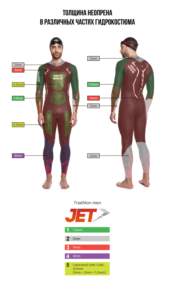 Гидрокостюм JET имеет гораздо больше эластичных неопреновых вставок разной толщины, а также стабилизирующие панели из облегченного воздушного неопрена (основная часть костюма – 3 мм, 1,5 мм на руках и в области подмышек, 2 мм в области шеи, запястий и задней части голеней, 4 мм на передней части голеней, толщина панелей с воздушными сотами достигает 4,5 мм).
