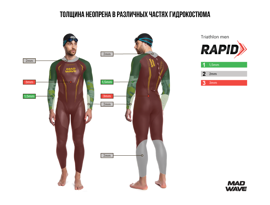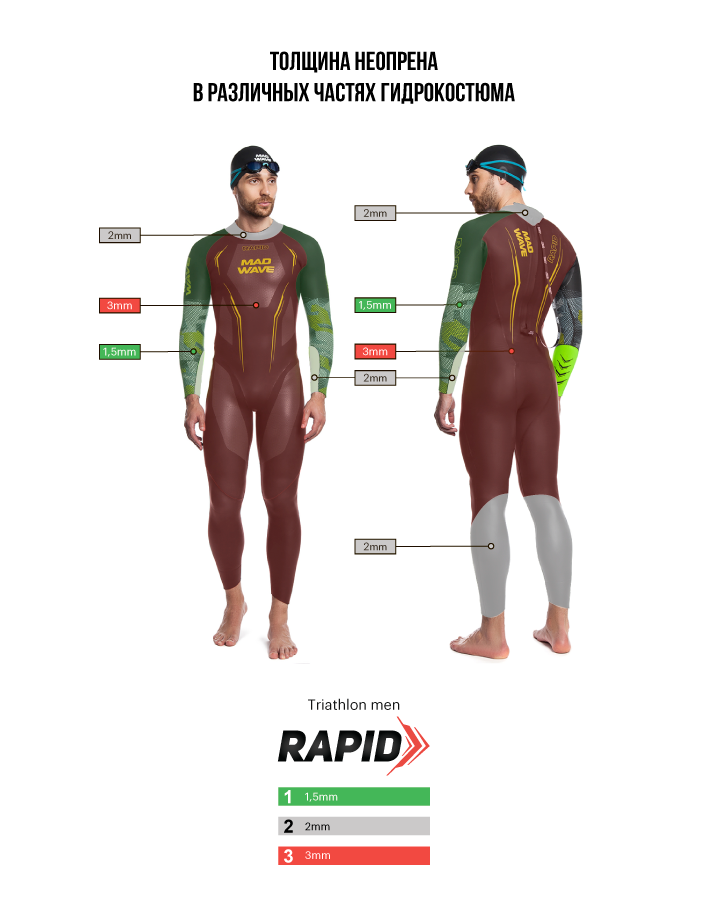 Основная часть гидрокостюма RAPID имеет толщину 3 мм, рукава - 1,5 мм, стойка горловины и задняя часть голеней - 2 мм.